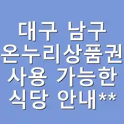 대구 남구에서 온누리상품권을 사용할 수 있는 식당은 전통시장과 골목상권에서 많이 운영되고 있습니다. 제로페이 앱을 활용하면 가맹점을 쉽게 찾아볼 수 있으므로, 사전 확인이 필수입니다. 이를 통해 식사 선택에서 경제적 이득을 누릴 수 있습니다.